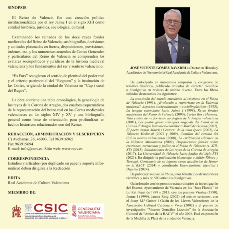 Examinando los reinados de los doce reyes forales medievales del Reino de Valencia, sus biografías, decisiones y actitudes plasmadas en fueros, disposiciones, provisiones, órdenes, etc. y los numerosos acuerdos de Cortes Generales y particulares del Reino de Valencia se comprenden los avatares sociopolíticos y jurídicos de la historia medieval valenciana y los fundamentos del ser y sentirse valenciano.